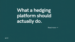Alt 21 Limited is authorised and regulated by the Financial Conduct Authority under both the Markets in Financial Instruments Directive and the Payment Services Directive (FRN: 783837). Alt21 Limited is authorised and regulated by the Financial Conduct Authority as an investment Firm to execute trades in FX Spot, Forwards and Options.